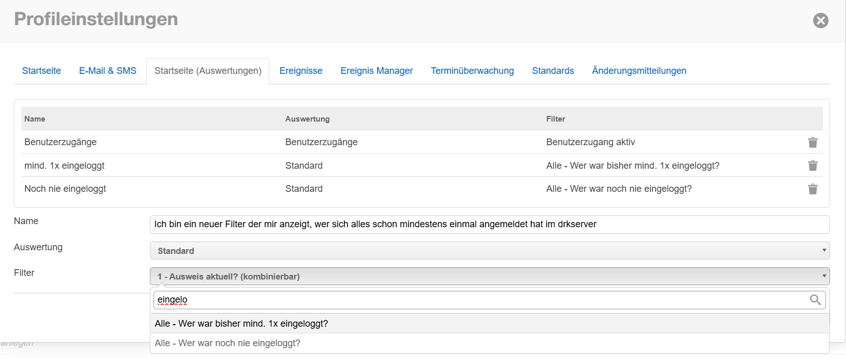 In unserem Beispiel wählen wir: Filter: "Alle - Wer war noch nie eingeloggt?" |