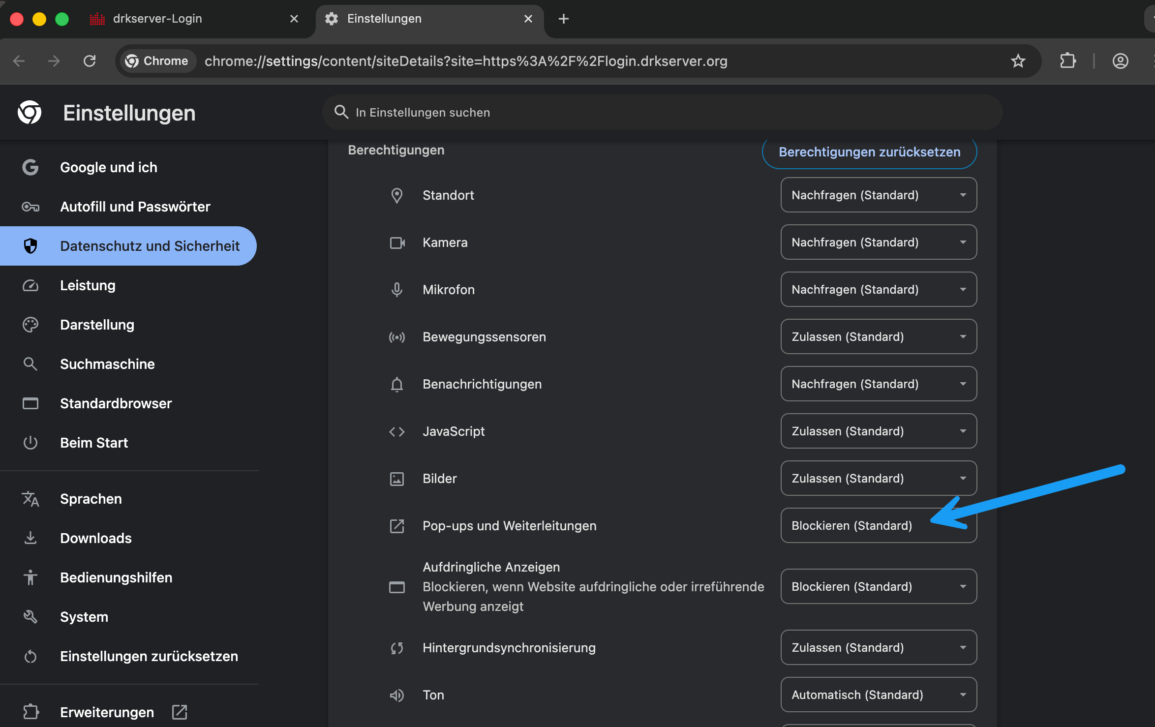 Hier muss bei Pop-ups und Weiterleitungen das Blockieren durch ein erlauben ersetzt werden.