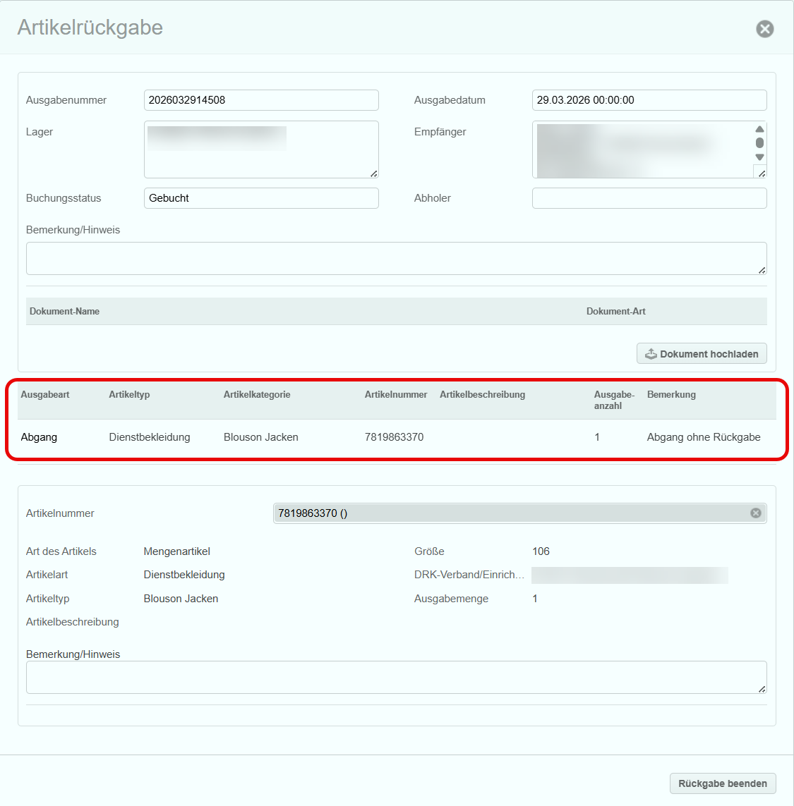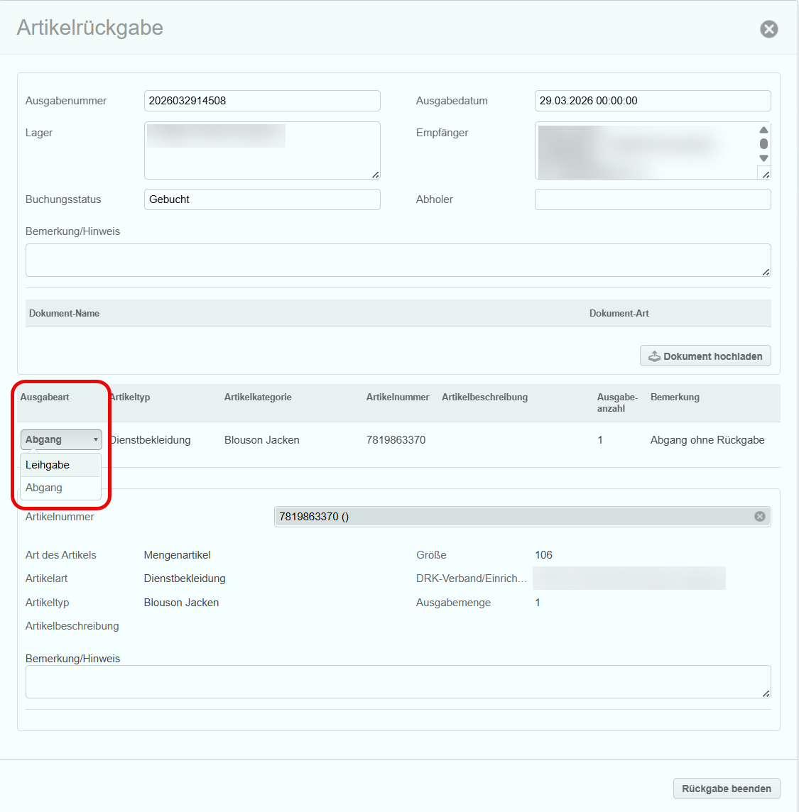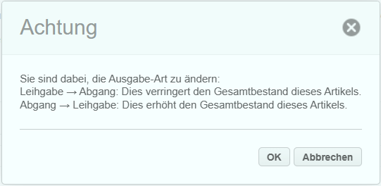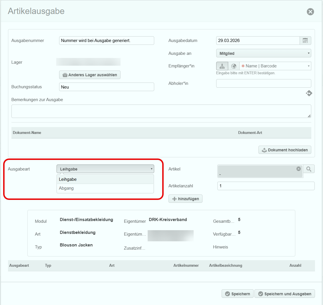 Bei der Ausgabe von Artikeln (Jacken, Hosen, Verbrauchsmaterial etc.) kann man bei der Ausgabe unterscheiden ob es sich um einen "Abgang" oder eine "Leihgabe" handelt. Die Art der Ausgabe definiert, ob der Artikel wieder zurückgegeben werden kann oder nicht.