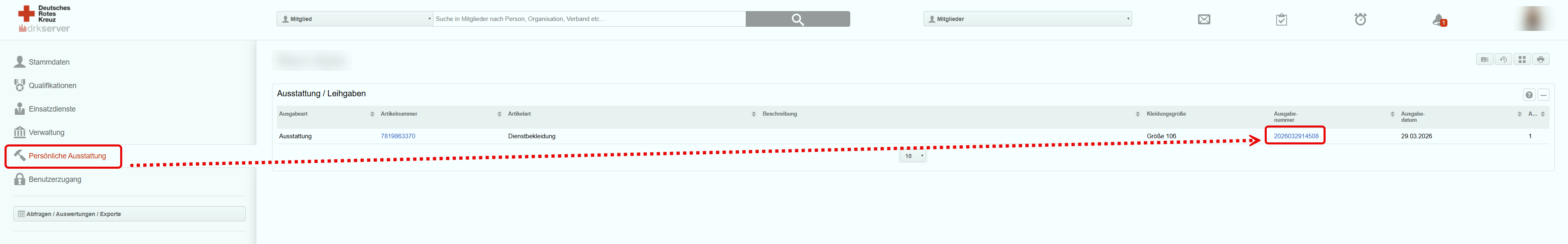 - Dort findet Ihr alle Artikel die an die entsprechende Person ausgegeben wurden. Bitte sucht dort den entsprechenden Artikel der mit der fehlerhaften Ausgabeart versehen wurde und klickt in diesem auf die "Ausgabenummer" (siehe Screenshot)